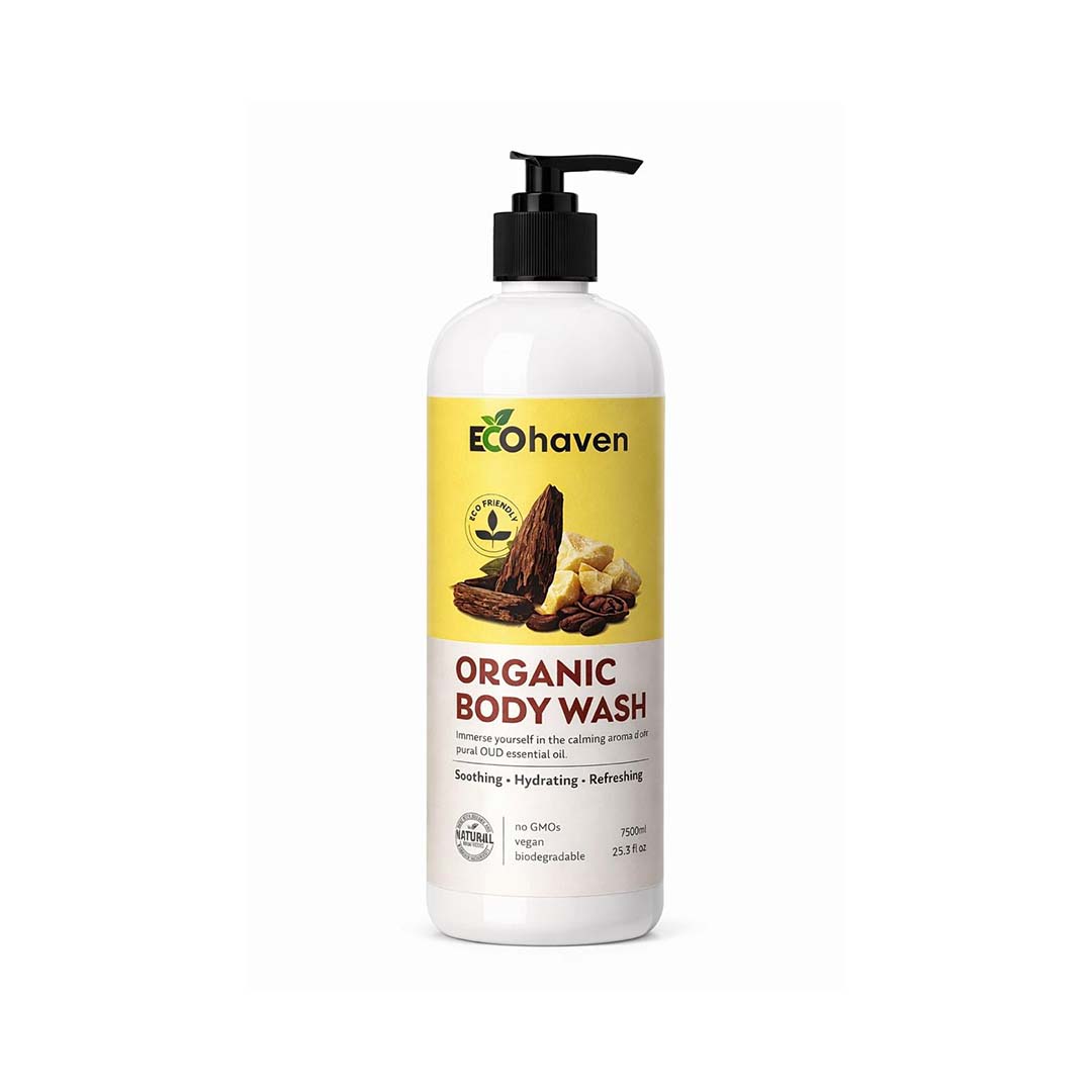 Our EcoHaven Organic Royal Oud Body Wash 750ml is a plant-based and biodegradable body cleanser designed to cleanse skin gently without harsh chemicals. This organic body wash effectively removes dirt and impurities while helping maintain the skin’s natural moisture balance. Made with a soothing, plant-derived cleansing formula, it delivers a rich yet mild lather that refreshes the skin without dryness or irritation.