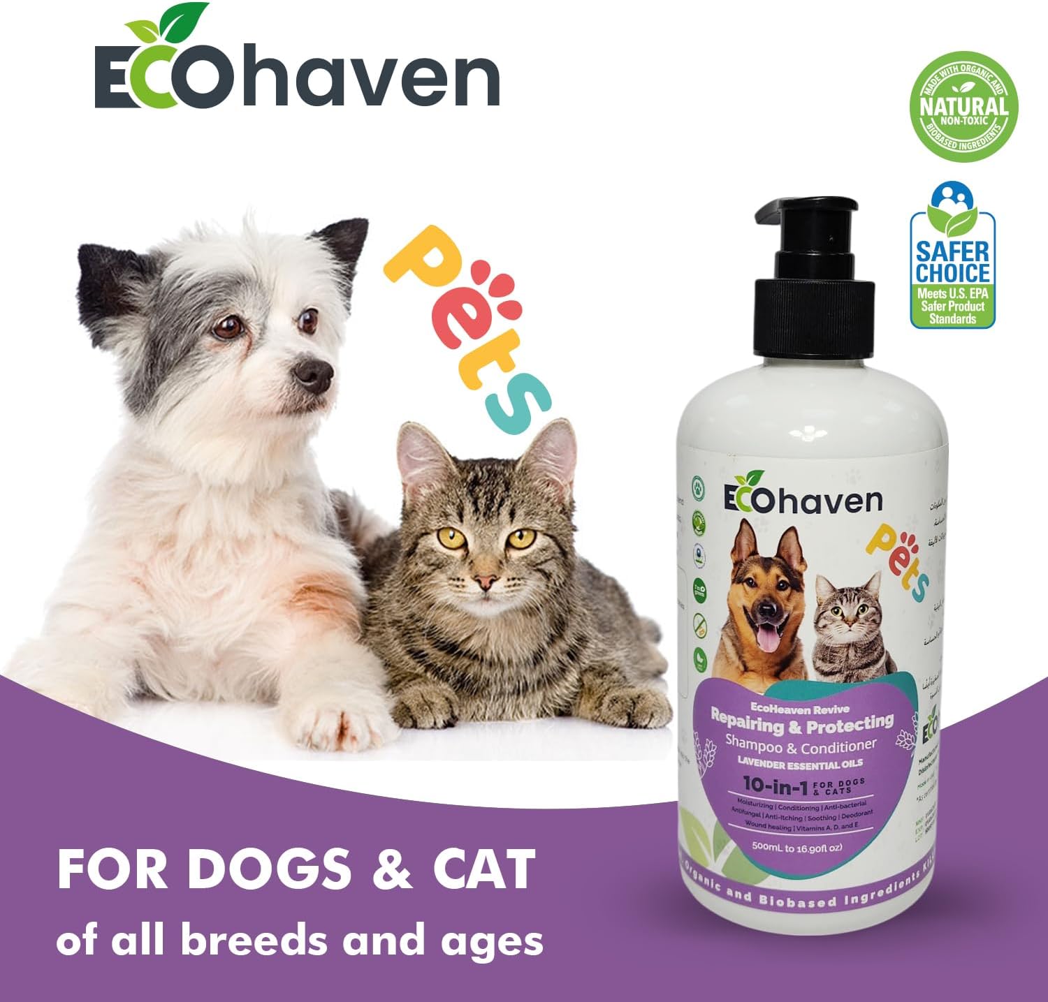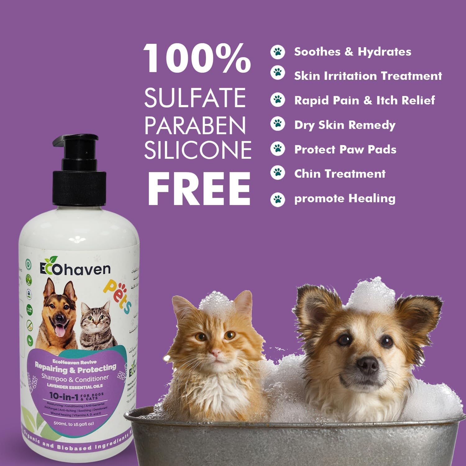 Give your pets the care they deserve with Eco-Haven’s Organic Repairing & Protecting Shampoo & Conditioner, a natural pet grooming formula designed to soothe, repair, and protect your pet’s coat. Enriched with lavender essential oil, aloe vera, and plant-based conditioners, this organic pet shampoo and conditioner gently cleanses while reducing dryness, irritation, and tangles. Perfect for dogs and cats, its non-toxic, eco-friendly blend restores shine, strengthens fur, and leaves a calming lavender scent — ideal for pets with sensitive skin or dull coats.