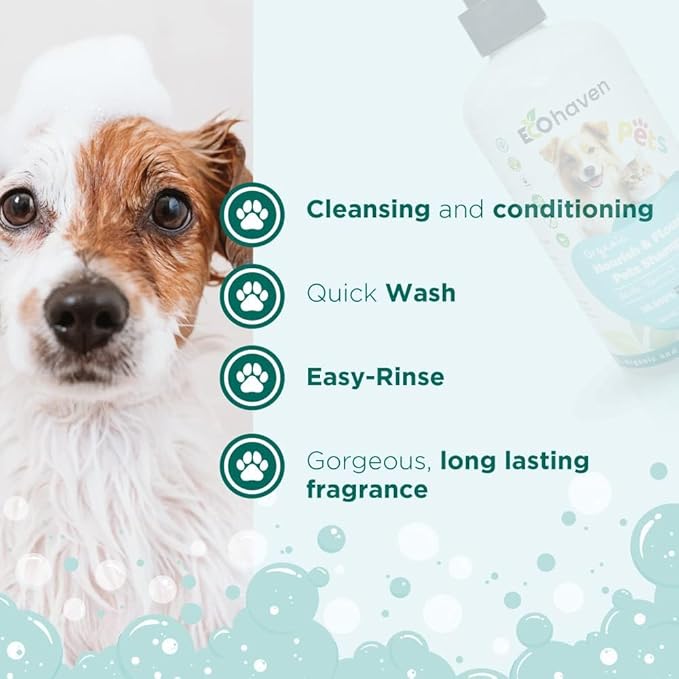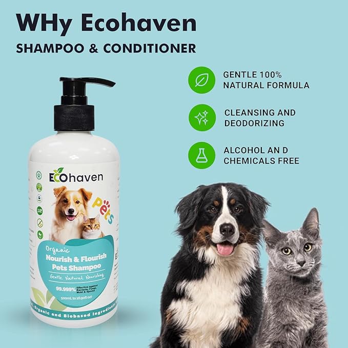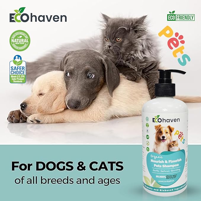 Soothe and refresh your pets with Eco-Haven’s Organic Nourish & Flourish Pet Shampoo, a natural, hypoallergenic shampoo made with chamomile and aloe vera. This organic dog and cat shampoo gently cleanses, hydrates, and relieves itchy or sensitive skin while leaving fur soft, shiny, and naturally fresh. The plant-based, non-toxic formula is perfect for puppies, kittens, and pets with allergies, providing a calming and nourishing wash that promotes healthy skin and coat without harsh chemicals.