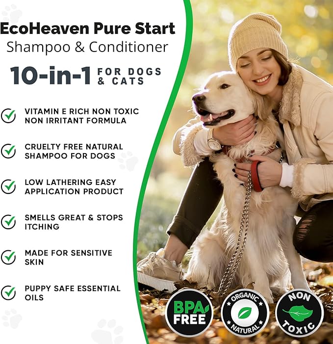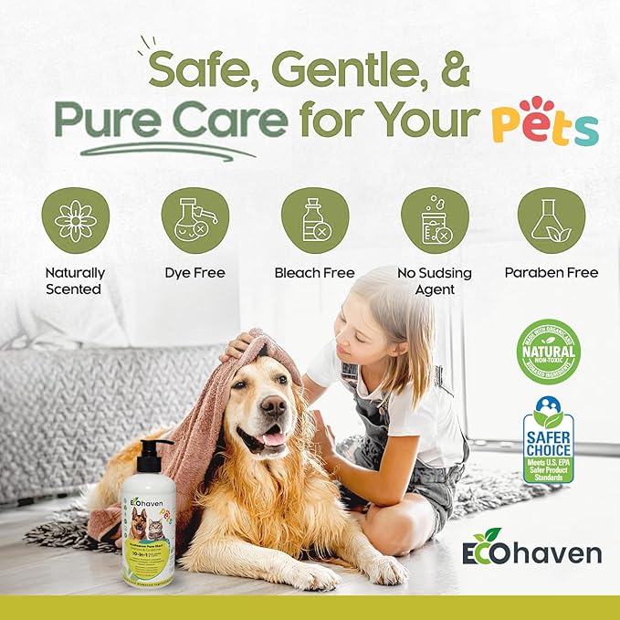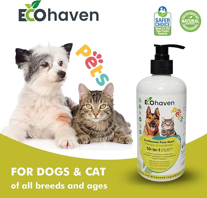 Give your pets the ultimate care with Eco-Haven’s Organic Pure Start 10-in-1 Shampoo & Conditioner, a natural dog and cat shampoo formulated with lemongrass and plant-based ingredients. This 10-in-1 pet shampoo cleanses, detangles, deodorizes, and nourishes, leaving your pet’s coat soft, shiny, and healthy. Designed for dogs, cats, puppies, and kittens, it’s a non-toxic, gentle shampoo for pets that soothes the skin and eliminates odors with a refreshing natural scent. Perfect for regular grooming and ideal for sensitive skin.