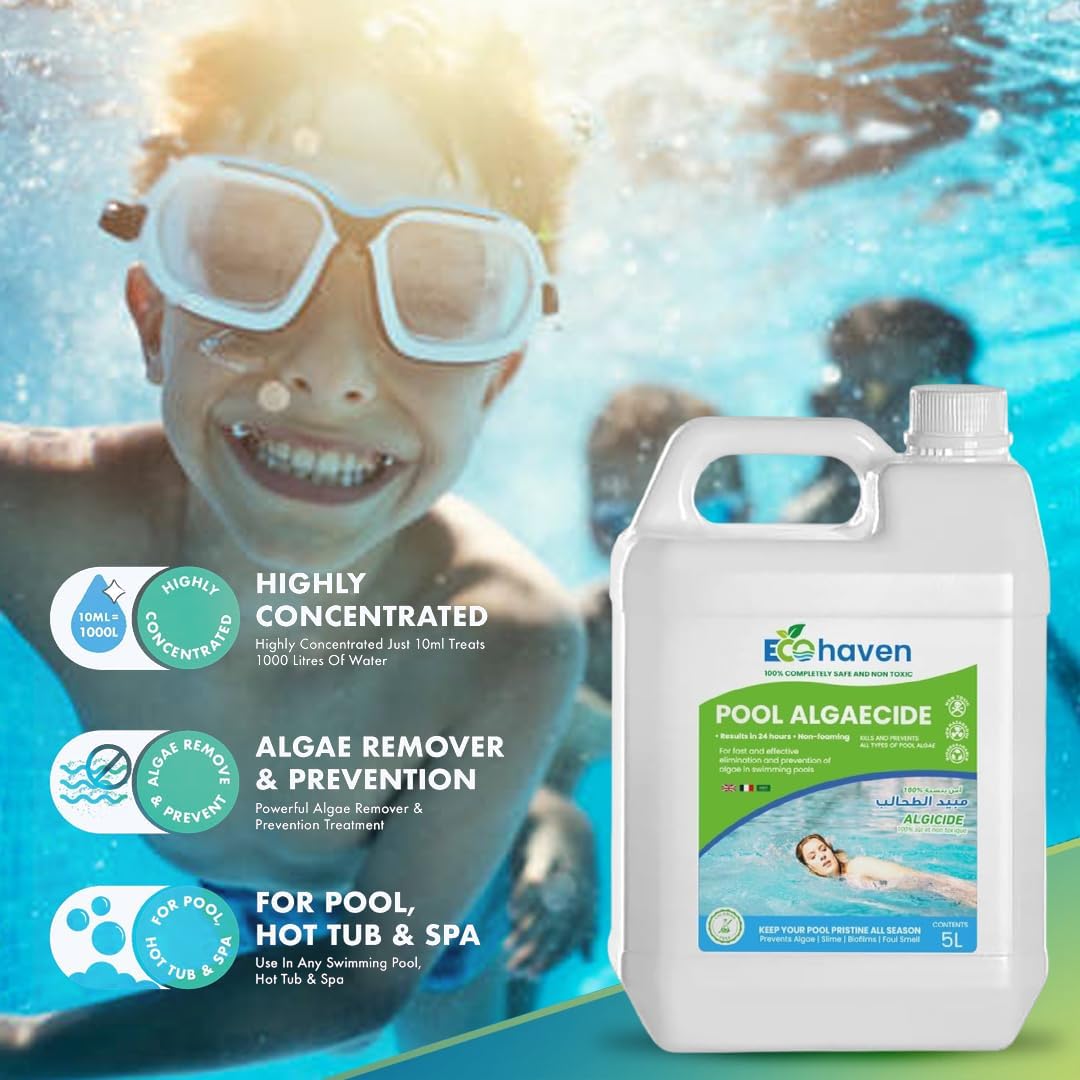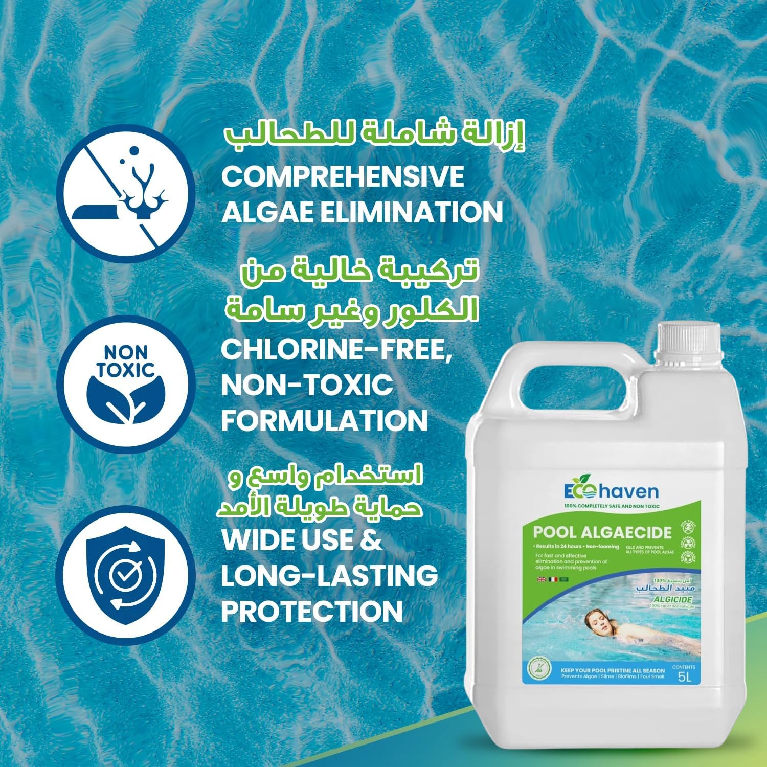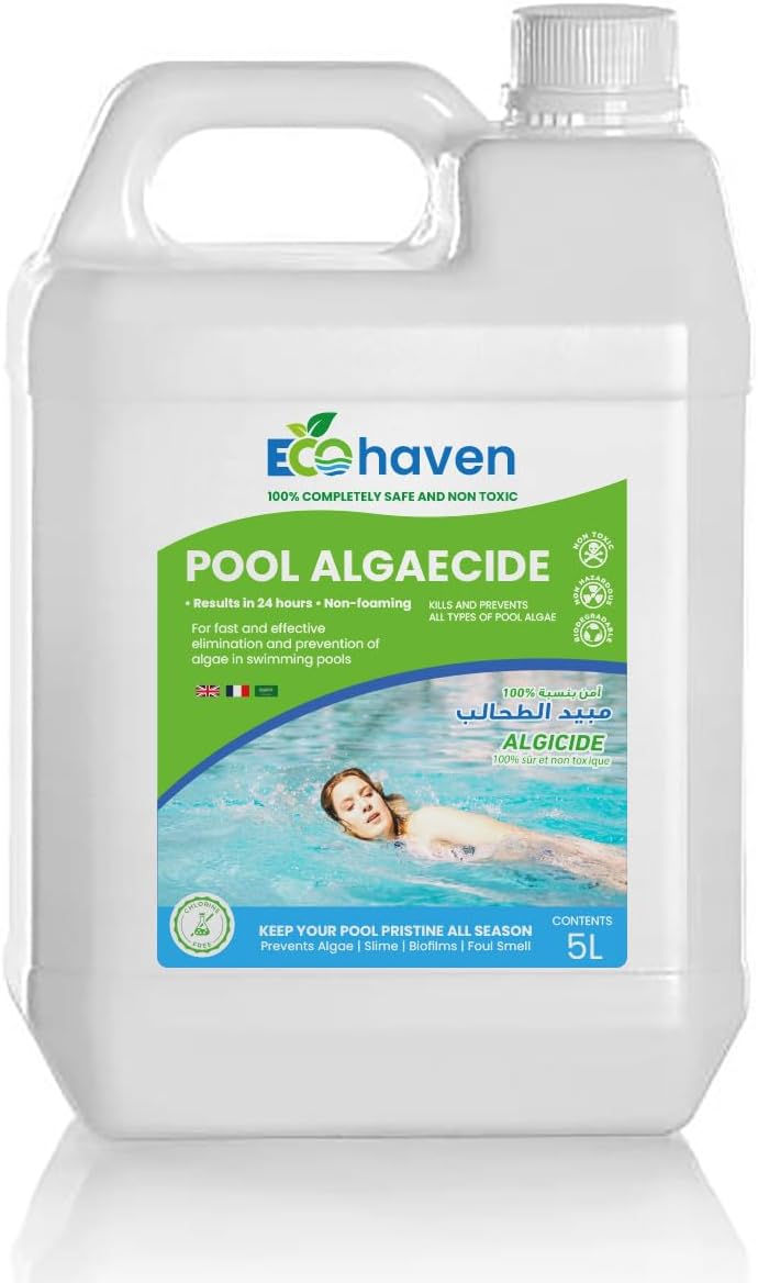 Maintain crystal-clear water with Ecohaven Algaecide, a 100% natural algaecide and non-toxic algae remover designed for effective algae prevention for swimming pools and water features. This biodegradable algaecide acts as a powerful yet safe natural algae control solution, protecting your pool from green, black, and mustard algae without the use of harsh chemicals. Ideal for eco-conscious homeowners, it serves as an organic pool algae killer that’s gentle on surfaces, humans, and aquatic life. Formulated as an eco-friendly algaecide, it’s also a safe algaecide for pets and kids, making it perfect for sustainable eco-friendly pool maintenance.